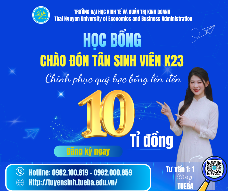 28/03/2026Với sứ mệnh đồng hành và kiến tạo tương lai cho thế hệ trẻ, năm 2026, Trường Đại học Kinh tế và Quản trị kinh doanh (TUEBA) chính thức triển khai chương trình học bổng "khủng" dành riêng cho Tân sinh viên Khóa 23 với tổng giá trị lên đến hàng chục tỷ đồng.